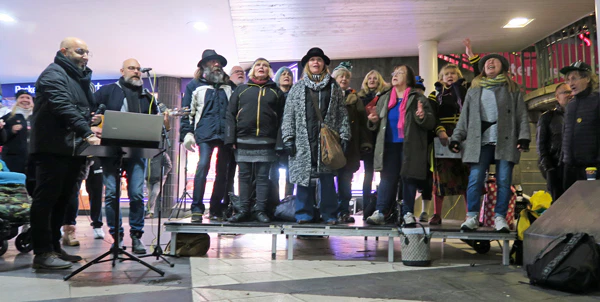 Några hundra personer stannade till på väg hem när kören – med hemlösa, färgstarka, lite udda medlemmar kända från tv som Gatans kör när de leddes av operasångaren Richard Söderberg – sjöng stämningsfullt från en uppfällbar scen intill Plattan.