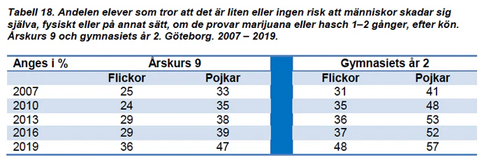 Men vad som sticker ut är att många högstadie- och gymnasieelever (majoritet av gymnasiepojkarna) i Göteborg svarar att de tror att det är liten eller ingen risk att man skadar sig om man provar cannabis ett par gånger. Var femte gymnasieelev tror inte heller att det är särskilt farligt att använda cannabis varje helg.