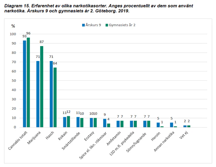 I Göteborgs skolenkät är det dock främst cannabis (cirka 90 procent) som anges bland de elever som svarar att de prövat. Men cirka tio procent av dessa har även prövat bland annat kokain, smärtmedlet tramadol och ecstasy.