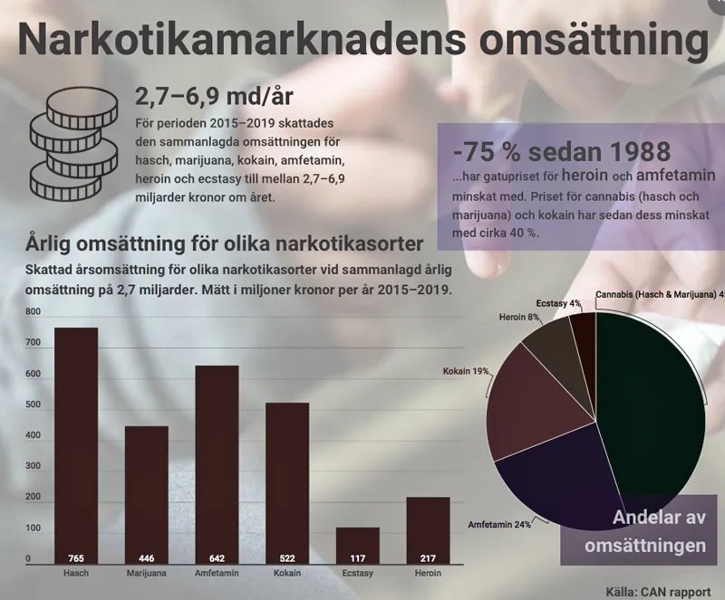 Priser på flera narkotikasorter i Sverige har sjunkit kraftigt de senaste decennierna. Samtidigt omsätter droghandeln mellan 2,7 och 6,9 miljarder kronor årligen, enligt en ny CAN-rapport. Cannabis står för 45 procent och har blivit basinkomst för kriminella gäng.