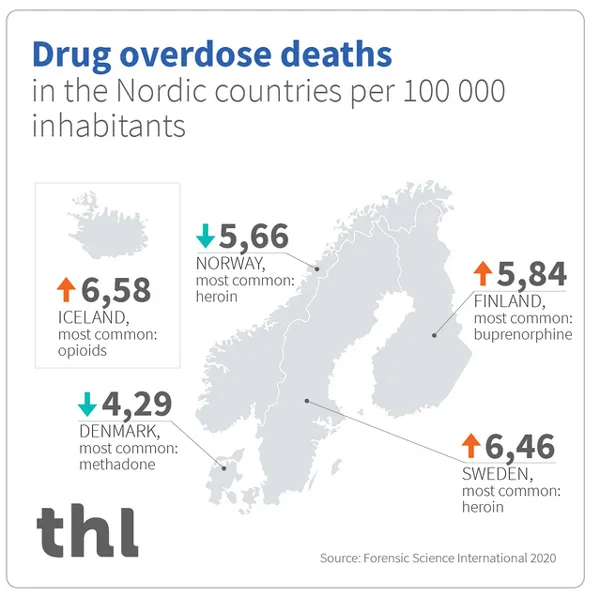 Narkotikarelaterad dödlighet är allvarligt problem i de nordiska länderna – opioider tar flest liv. Island och Sverige sticker ut med högre dödlighet, utifrån ny forskningsrapport. Under tre decennier har dödliga överdoser fyrdubblats i Sverige fram till mätåret 2017, (men minskade året därpå).