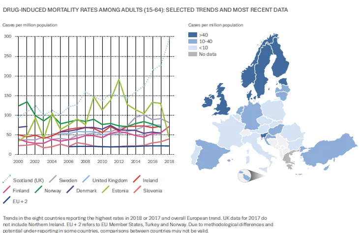 Åtta länder i norra Europa hamnar i EU-statistiken för 2018 över 40 dödsfall per miljon invånare, i åldersgruppen 15-64 år. Efter Sverige kommer Storbritannien (72 dödsfall per miljon invånare, exklusive Nordirland 2017), även Irland och Finland på lika nivå (72/milj.), följt av Norge (66/milj.), Danmark (52/milj.), Estland (åkt ner till 43 döda/ per miljon invånare) och Slovenien (41/milj.). Området Skottland hamnar dock i särklass högst i Europa om det särredovisas, (295 dödsfall per miljon invånare enligt rapporten).