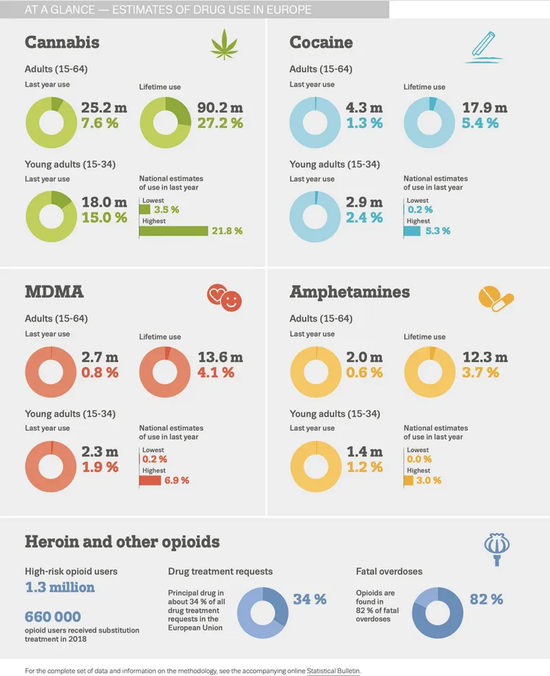 Unionens narkotikabyrå EMCDDA presenterade i tisdags ”Europeisk narkotikarapport 2020 trender och utveckling” (pdf-fil, 88 sidor). Den omfattar alla EU-länder, samt Norge och Turkiet, och belyser narkotikamarknaden, bruket och relaterade skador och åtgärder i Europa.