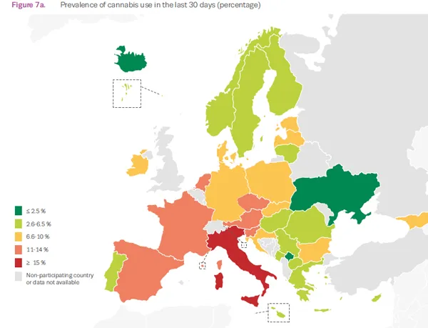 1995 uppgav 11 procent av de europeiska tonåringarna att de använt cannabis någon gång. Livsprevalensen har minskat sedan 2011, medan användning senaste månaden stabiliserats från 2007.