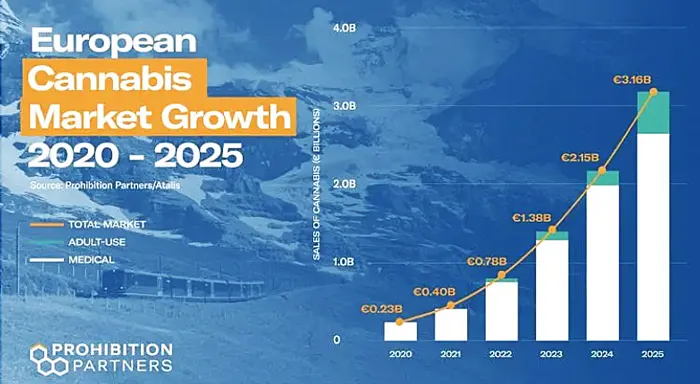 Det sammantagna marknadsvärdet för medicinsk cannabis blev 230,7 miljoner euro i under 2020, vilket man tror kommer att öka till 3,2 miljarder euro år 2025. Det motsvarar omkring 33 miljarder kronor, vilket vore en anmärkningsvärd utveckling med tanke på de hittills svaga vetenskapliga beläggen om medicinsk nytta av cannabis eller dess beståndsdelar.