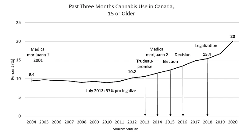 Effekterna visar nu att cannabisanvändning har ökat kraftigt i befolkningen. Under perioden 2004–2020 har antalet cannabisanvändare i Kanada som använt cannabis de senaste tre månaderna fördubblats, från 9,4 till 20 procent, (15 år och äldre). Bara under perioden 2018-2020 har antalet användare ökat från 4,1 miljoner eller 14 procent strax före legaliseringen till 6,1 miljoner eller 20 procent tre år senare.