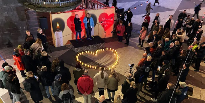 Tända gravljus bildade ett ljushjärta framför scenen. Många stannade till, såg på de fladdrande ljusen, begrundade och gick vidare i höstmörkret.