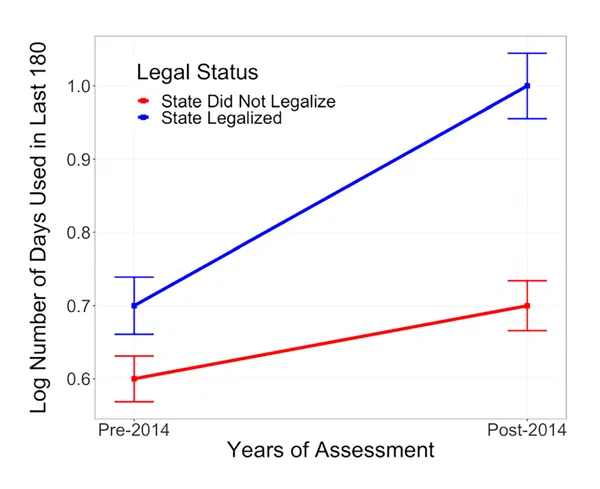 Man har sedan analyserat uppgifter i hälsoundersökningar om deras bruk av cannabis före 2014, då drogen var förbjuden i hela USA, och sedan några år efter 2014. Deltagarna var mellan 16,5 år och 34,7 år vid första analystillfället, och ungefär tio år äldre vid det andra.