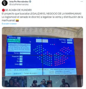 En av de främsta motståndarna till förslaget, Jota Pe Hernández från Grön Allians, kommenterade resultatet på Twitter: ”Vi gjorde det!! senaten säger NEJ till att legalisera försäljning och distribution av marijuana!!”. Jota Pe Hernández ställningstagande har varit kontroversiellt i det egna partiet, som står bakom förslaget.