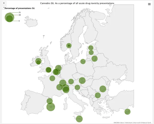 Cannabis svarar för 25 procent (medianvärde) av de akuta sjukhusfallen med narkotikaförgiftningar. Högsta andelen under 2021 hade sjukhuset på Mallorca med 59 procent. Övriga sjukhus med hög andel cannabispatienter ligger framför allt i södra och östra Europa: Lugano, Ba