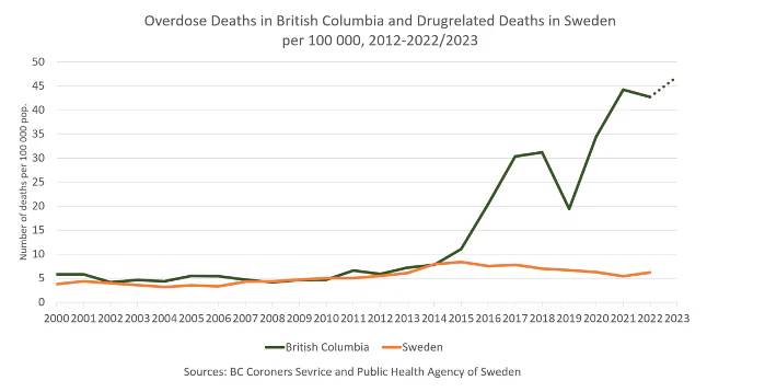 Om jämförelser av nivåer på narkotikadödlighet ska göras med försiktighet kan trender jämföras. Medan narkotikadödligheten i British Columbia ökat dramatiskt från 2014-2015 har den i Sverige minskat med 35 procent åren 2015-2021, för att under 2022 öka något.