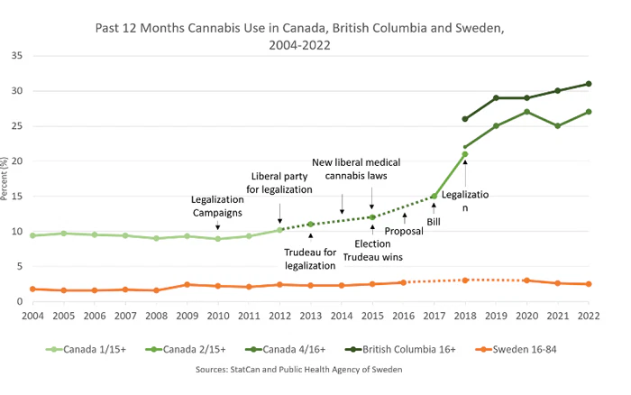 Parallellt med opioidkrisen har Kanada och inte minst British Columbia en cannabisepidemi med kraftigt ökande användning och som en följd av detta ökade skadeverkningar. Ökningen började redan i samband med kampanjer och förberedelser för legaliseringen i oktober 2018 och har sedan fortsatt. I British Columbia är cannabisbruket högre än genomsnittet för Kanada. Även här skiljer sig trenderna åt och medan den är stabil på en låg nivå i Sverige har den ökat kraftigt i Kanada och British Columbia.
