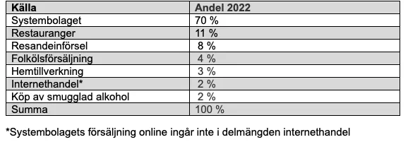 Insmuggling av alkohol har minskat, jämfört med före pandemin. Restaurangförsäljningen är tillbaka på samma nivå. Systembolagets försäljning som ökade under pandemin är fortsatt relativt hög (cirka 70 procent av totala alkoholmarknaden, en ökning från 65 procent före pandemin).