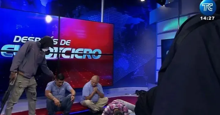 Under en nyhetssändning i tisdags på TC Television i hamnstaden Guayaquil vid Stilla havet tog sig ett tiotal beväpnade män in i under direktsändning och hotade programledare och annan personal som tvingades lägga sig på golvet. Tv-ljusen släcktes, men ljud hördes under fortsatt sändning. En halv timme senare kunde polis ta sig in och få kontroll, samtidigt som en röst ropade att det fanns skadade i lokalen, men ingen blev allvarligt misshandlad.