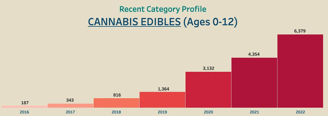 DC Antalet barn under tolv år i USA som förgiftas av cannabisgodis fortsätter stiga. Den amerikanska giftinformationscentralen tog emot 6 379 sådana samtal under 2022. Sex år tidigare var sådana samtal 187, (dvs 34 gånger fler). Men det är bara toppen på isberget. Många fler söker hjälp direkt på sjukhus.