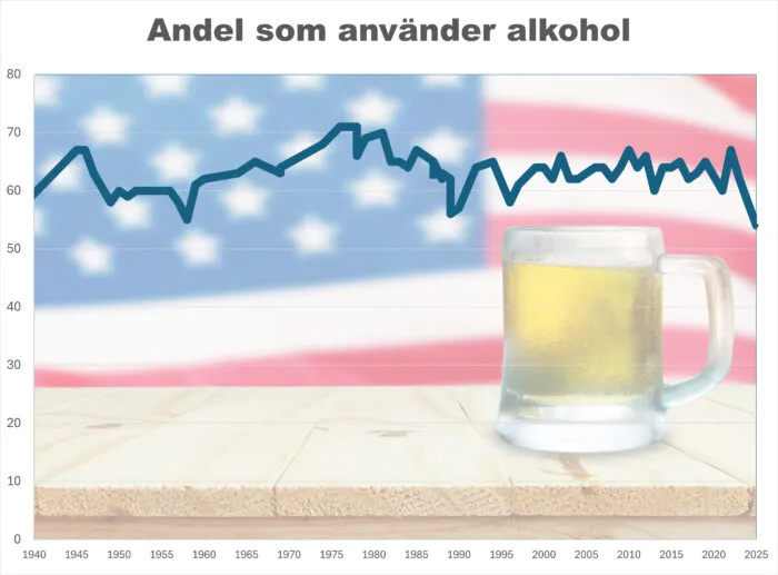 Mellan 1997 och 2023 låg andelen som drack stabilt över 60 procent. Men sedan dess har siffran sjunkit till 62 procent 2023, 58 procent 2024 och nu 54 procent. Det är den lägsta noteringen i Gallups nästan 90-åriga mätserie. Tidigare har konsumtionen bara varit under 60 procent vid ett fåtal tillfällen.