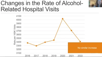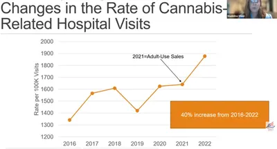 Resultaten visade att sjukhusbesök relaterade till cannabis ökade med 40 procent mellan 2016 och 2022. (se skärmklipp på graf från ett webbinarium). De alkoholrelaterade besöken var till en början ungefär dubbelt så många, men ökade betydligt mindre.